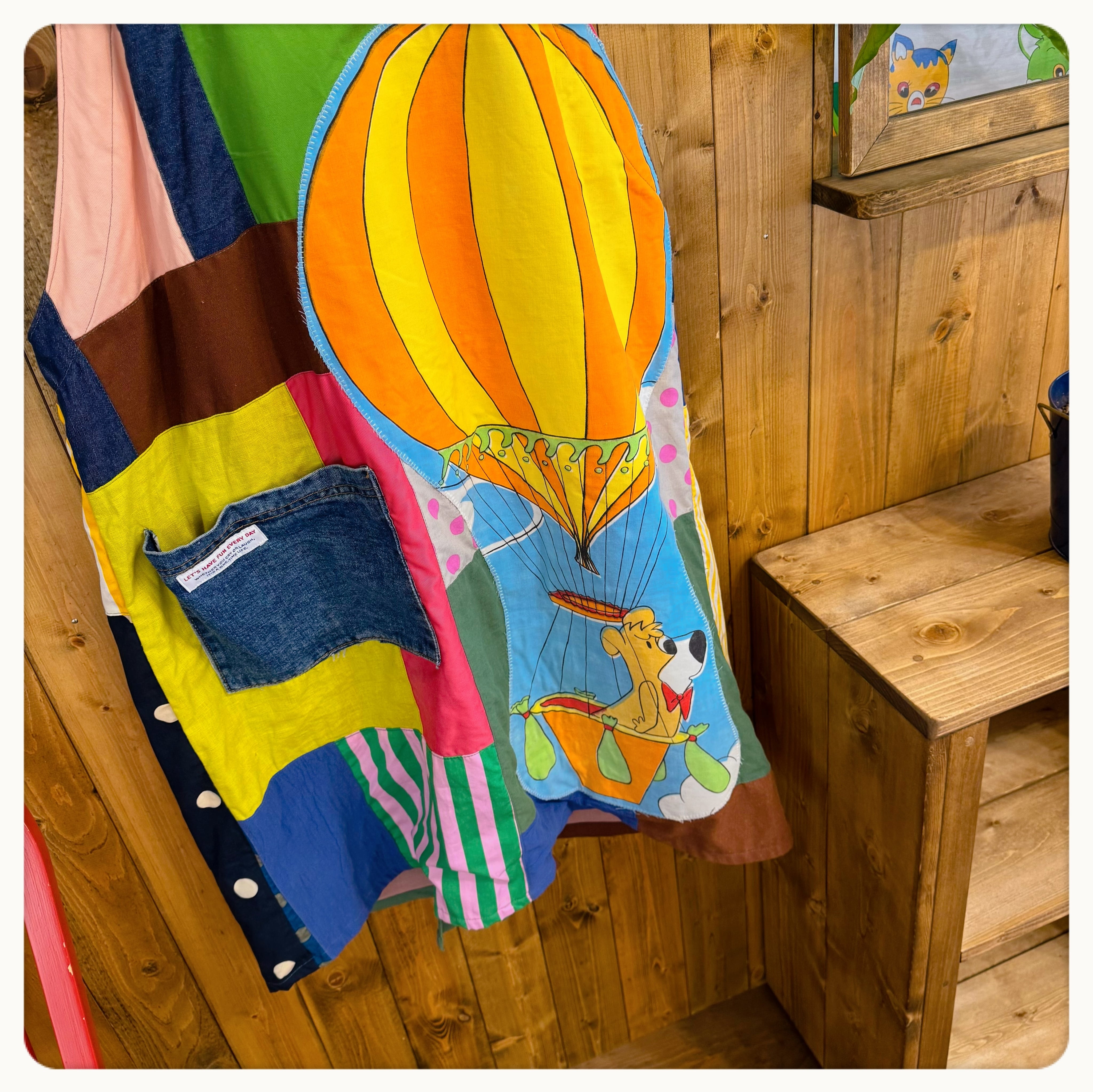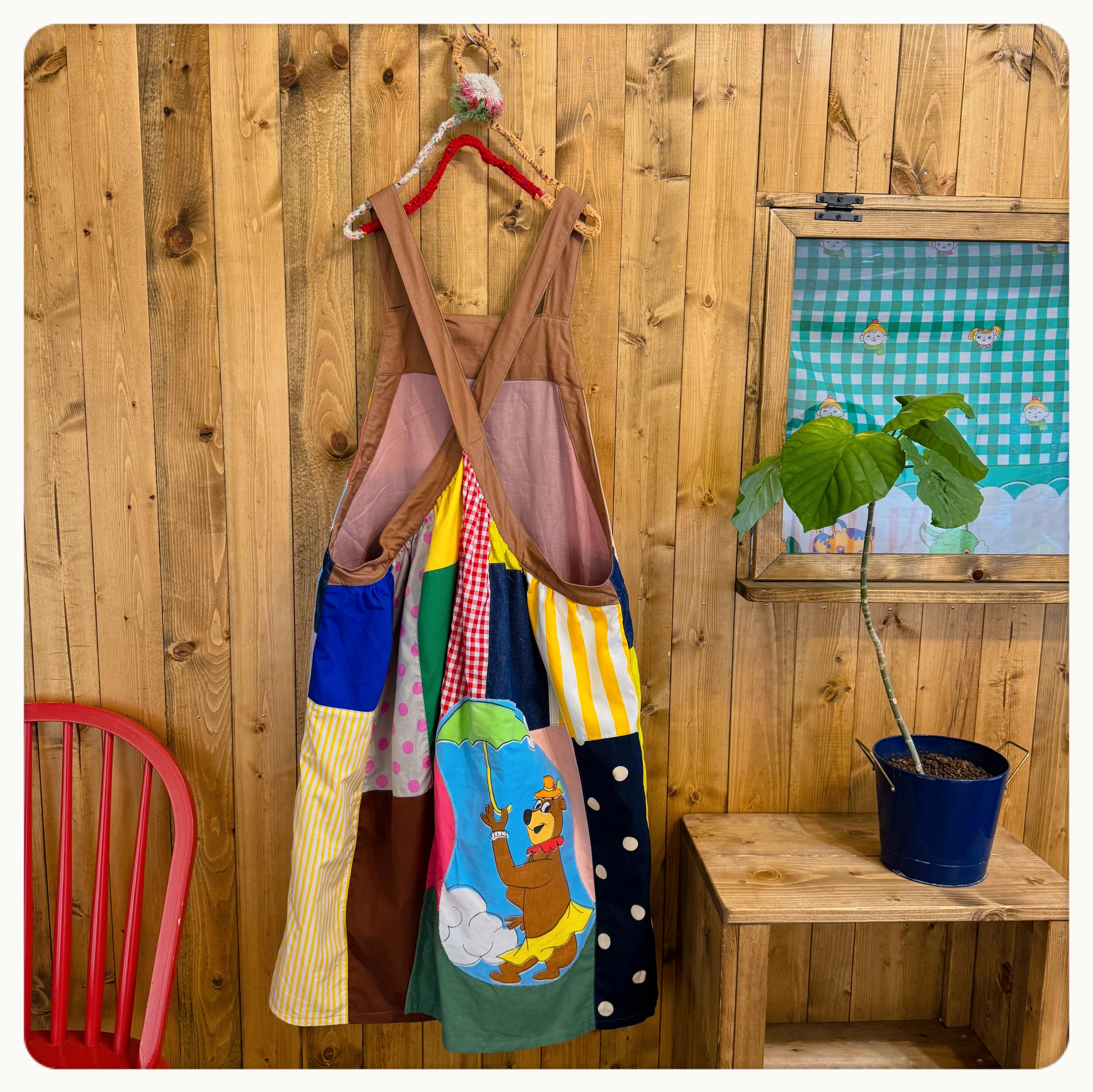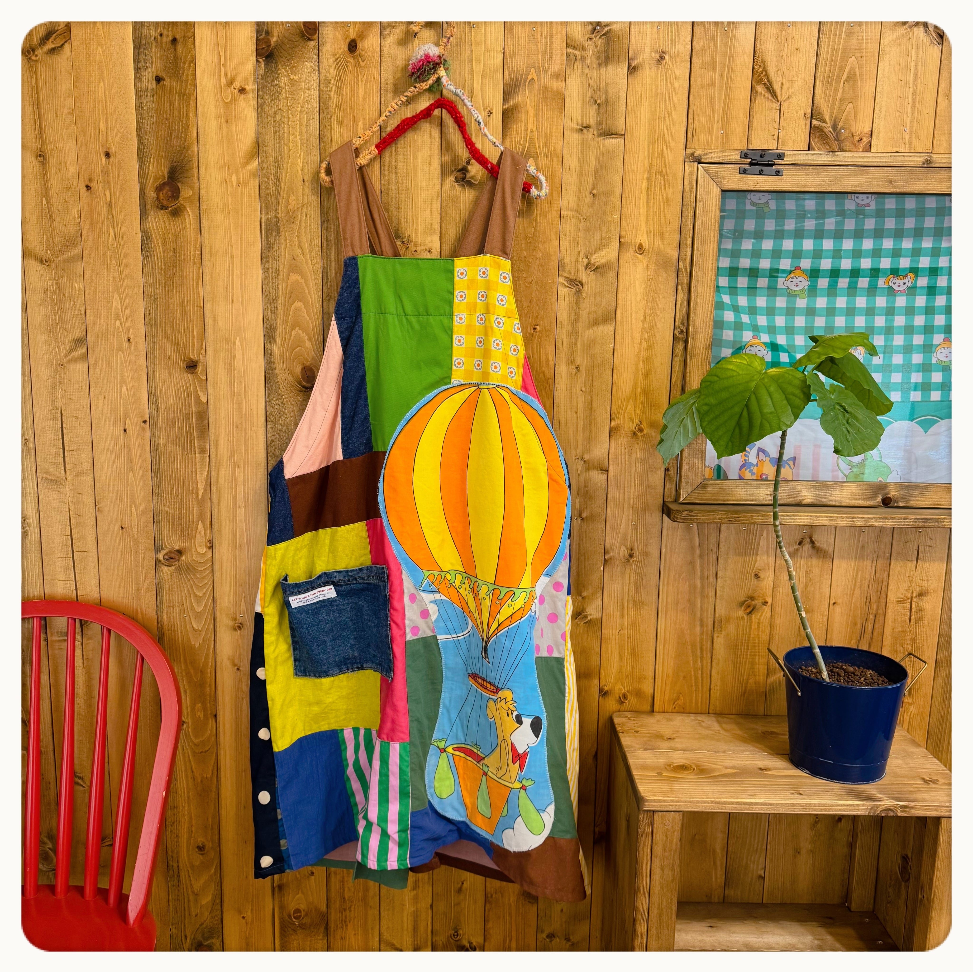 カラフルな布を丁寧にパッチワークした、世界にひとつのエプロンワンピースです。