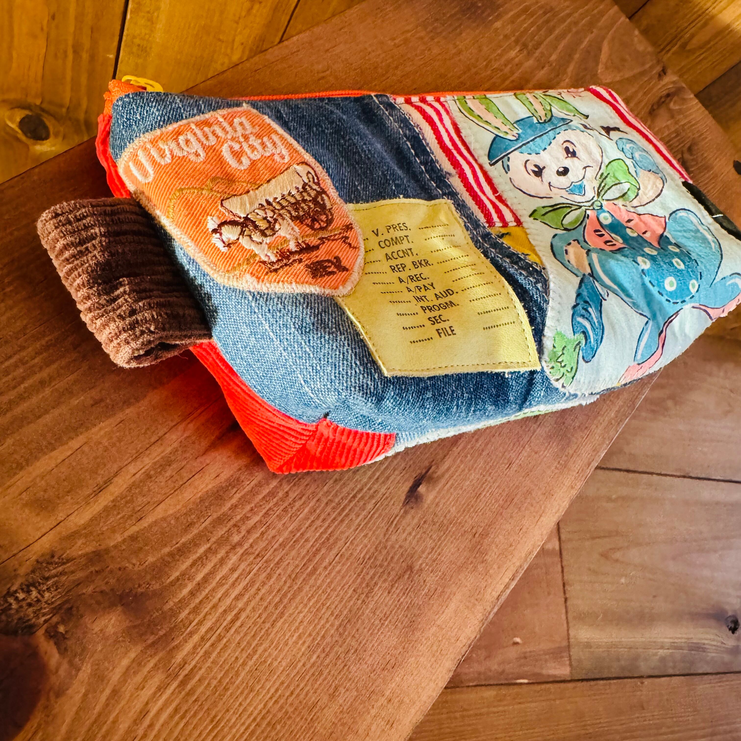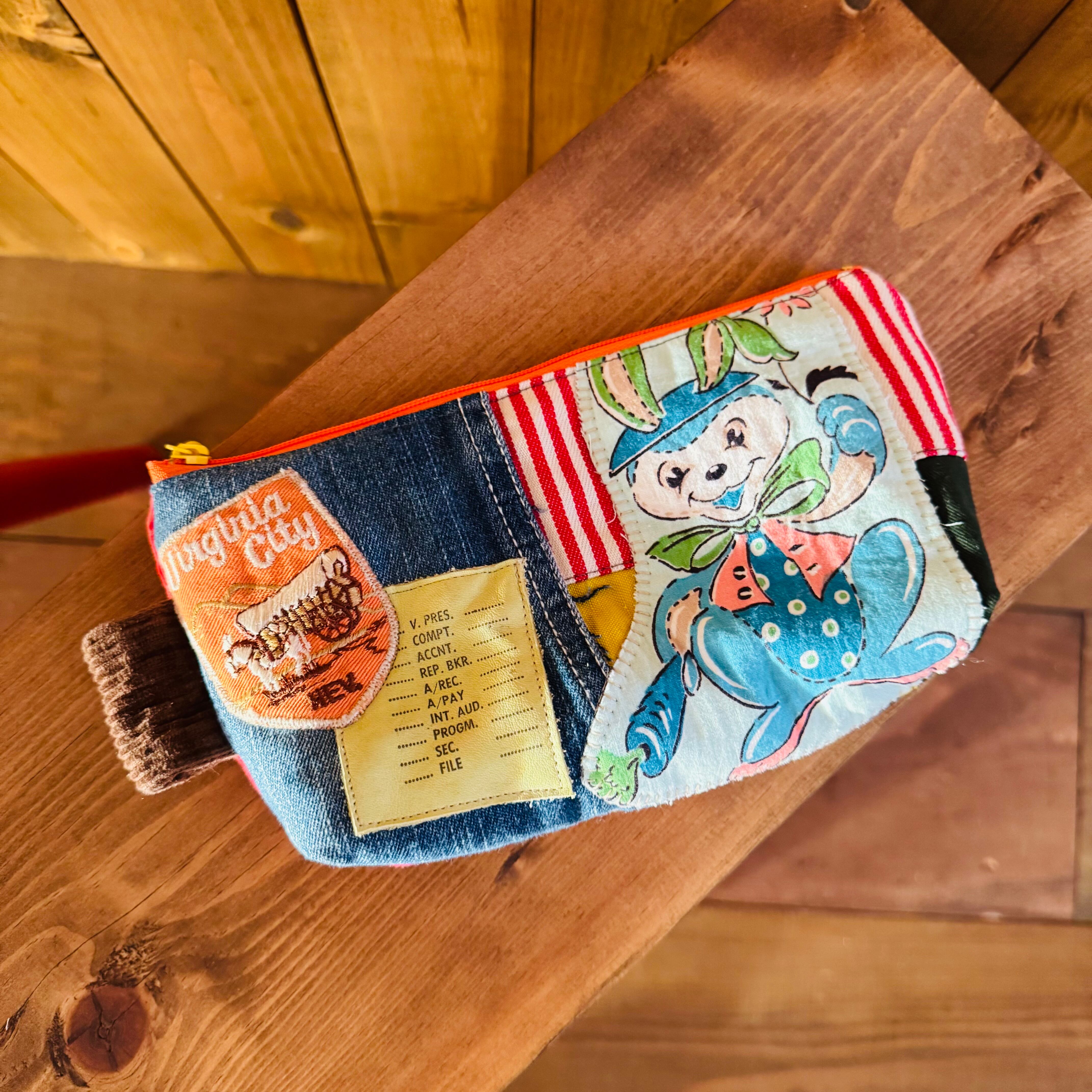 ビンテージ生地のレトロアニマルとデニム、カラフルでPOPな生地を組み合わせたペンケースです♪