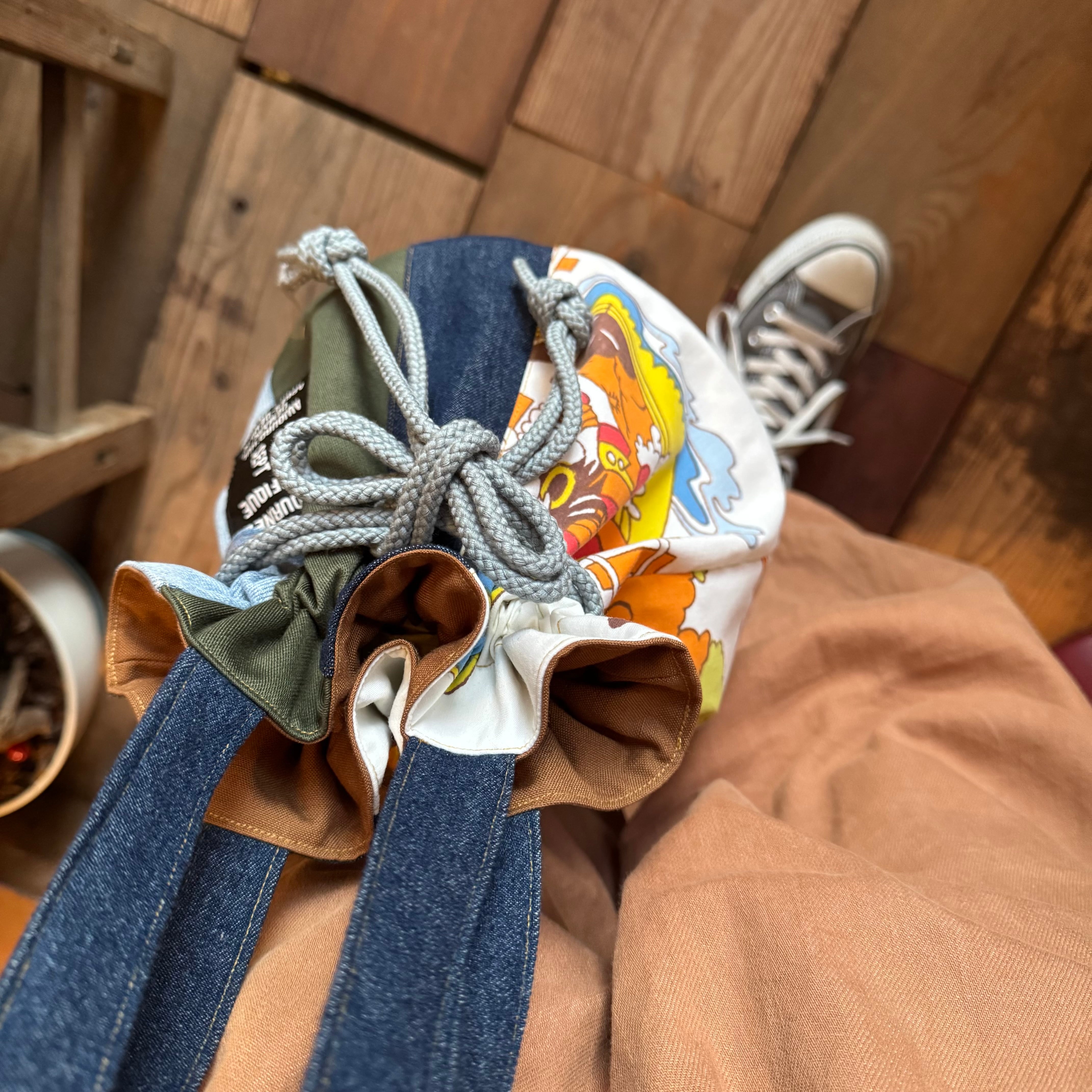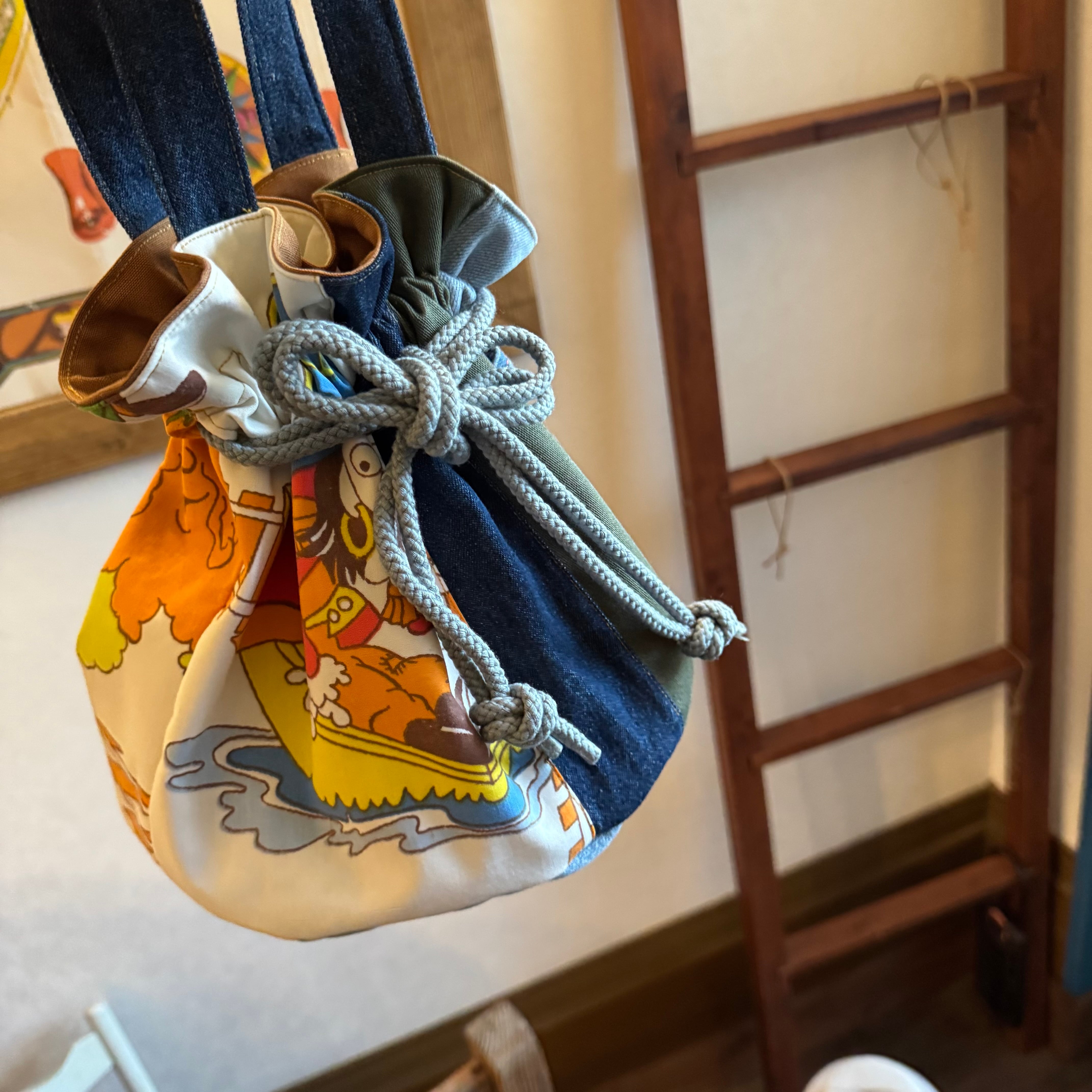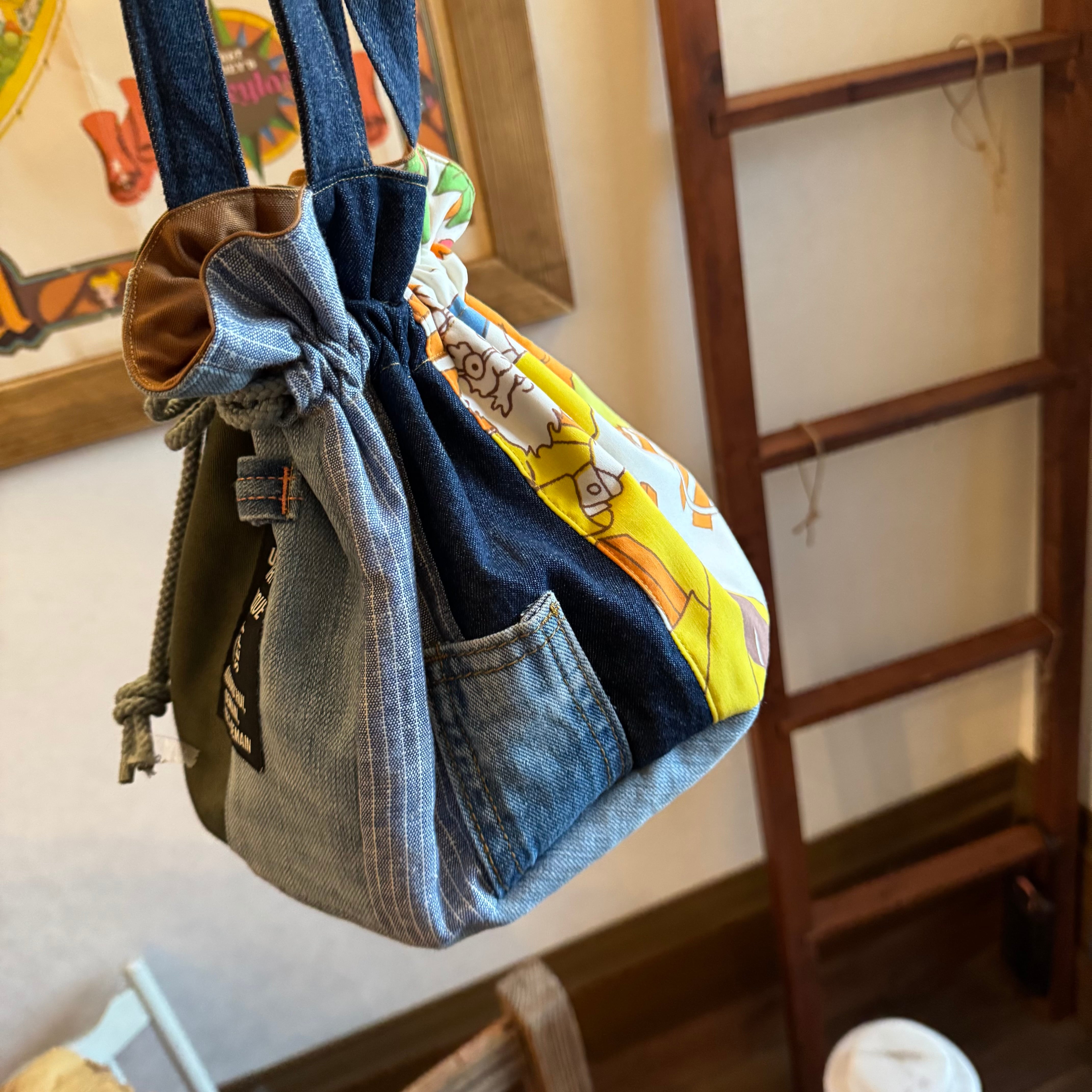 デニムにビンテージ生地を合わせた、小ぶりなサイズの巾着バッグ