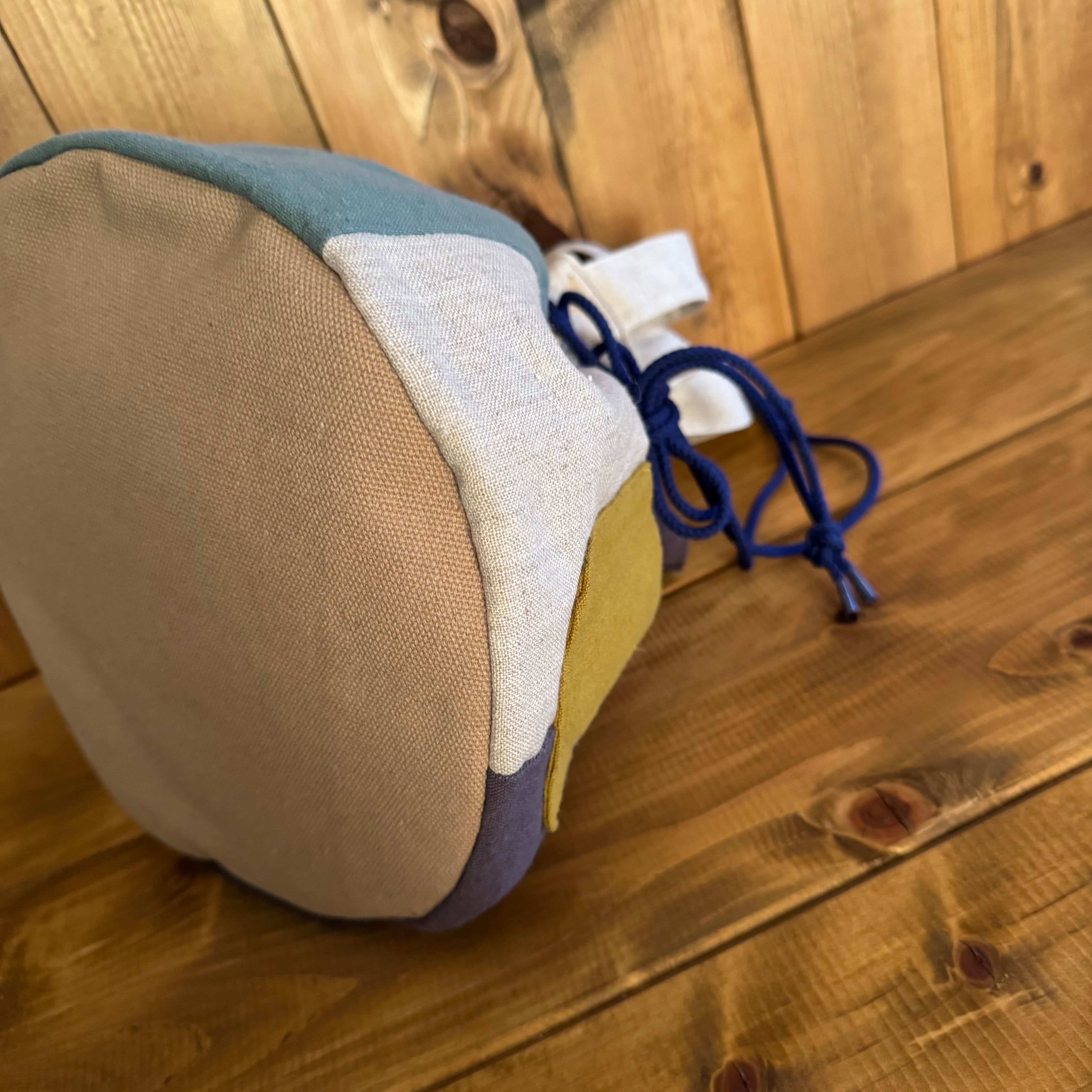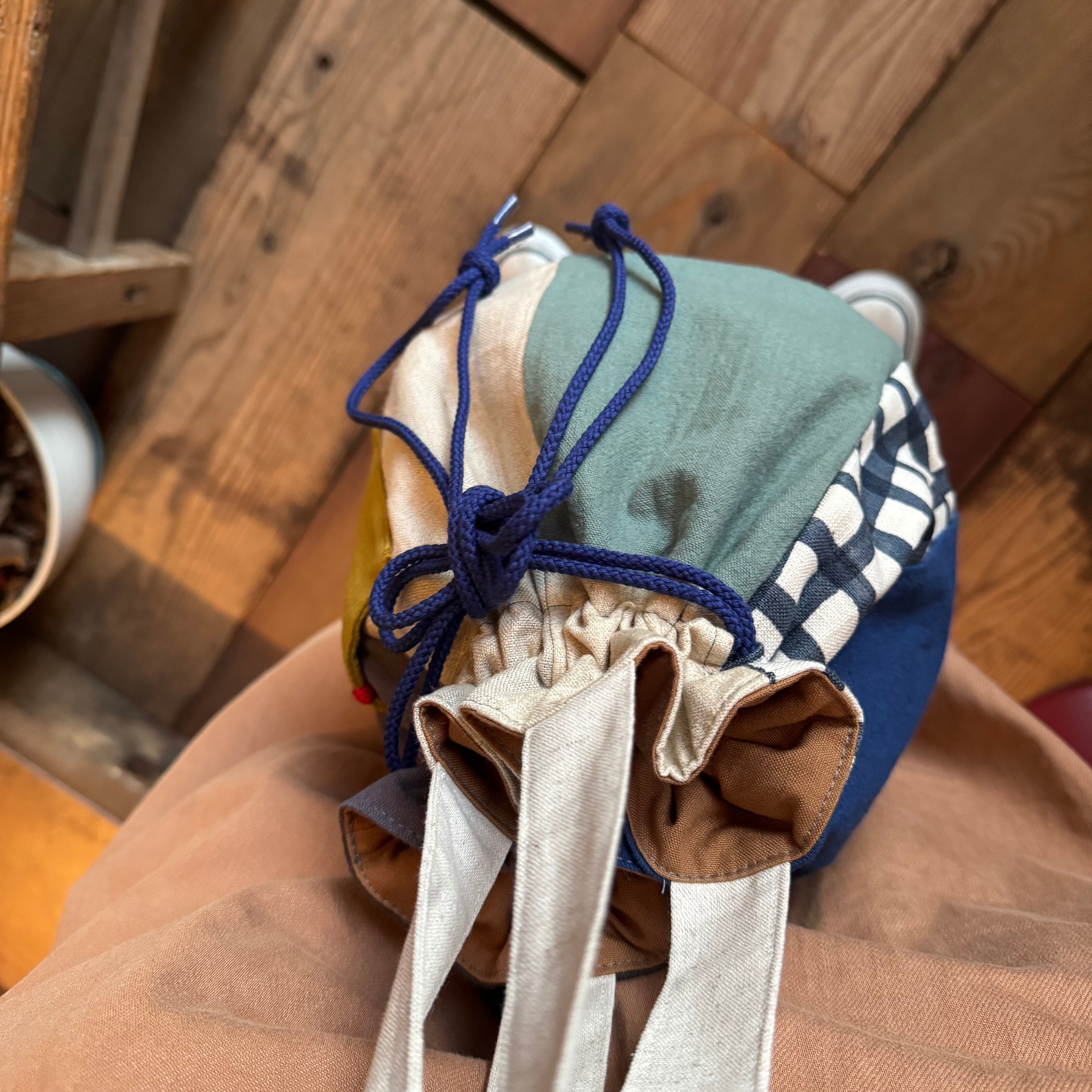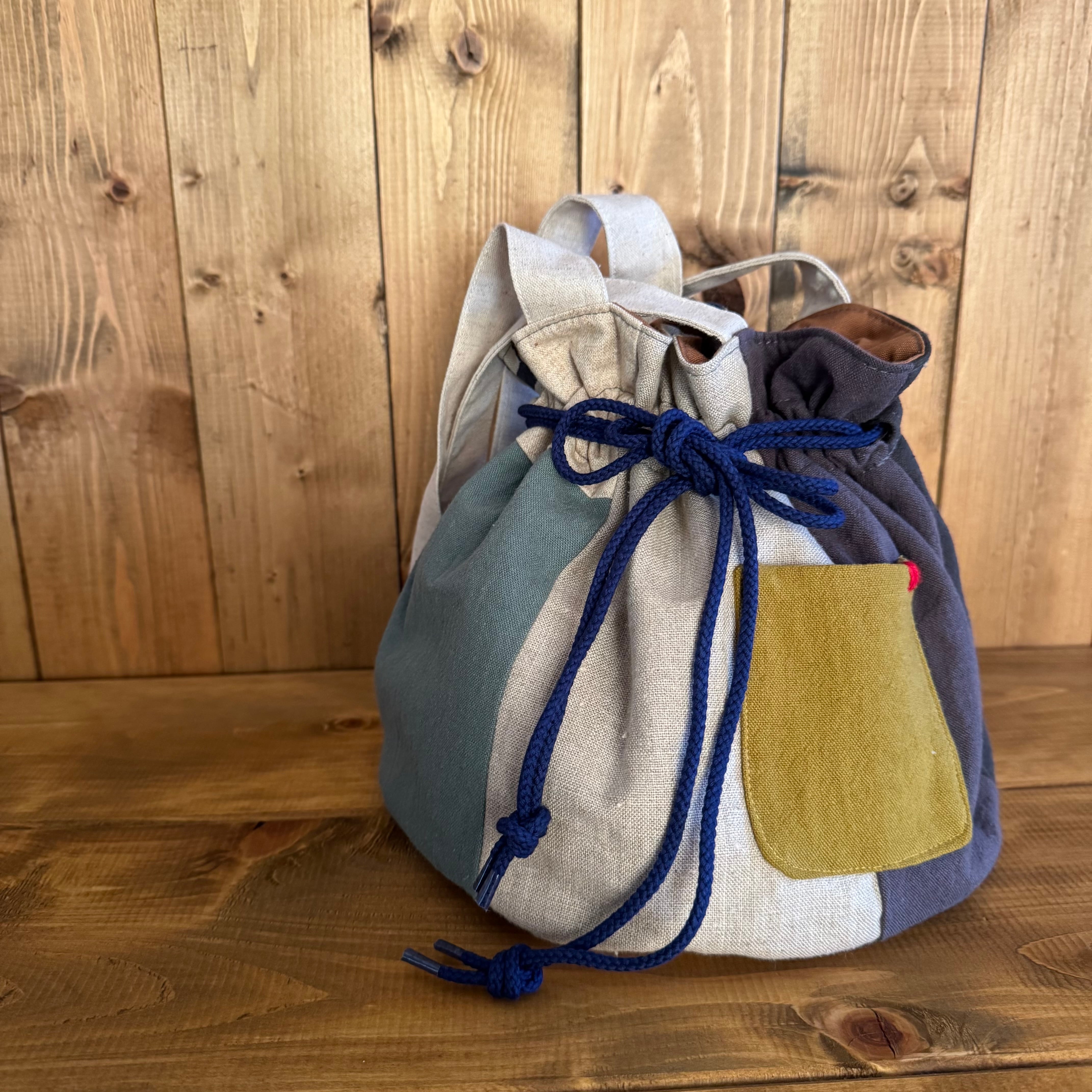 コットンリネンなどのかわいい生地を合わせた、小ぶりなサイズの巾着バッグ