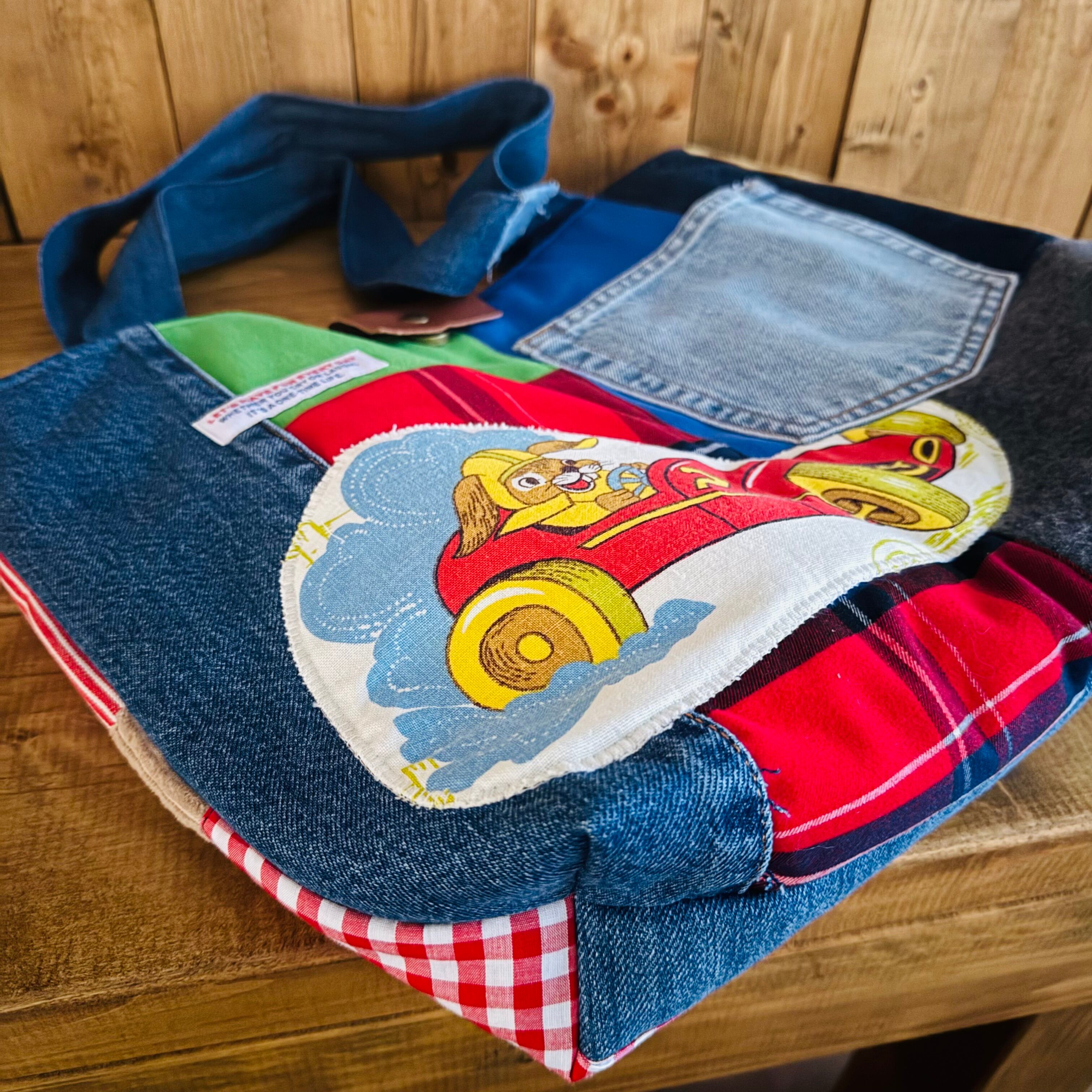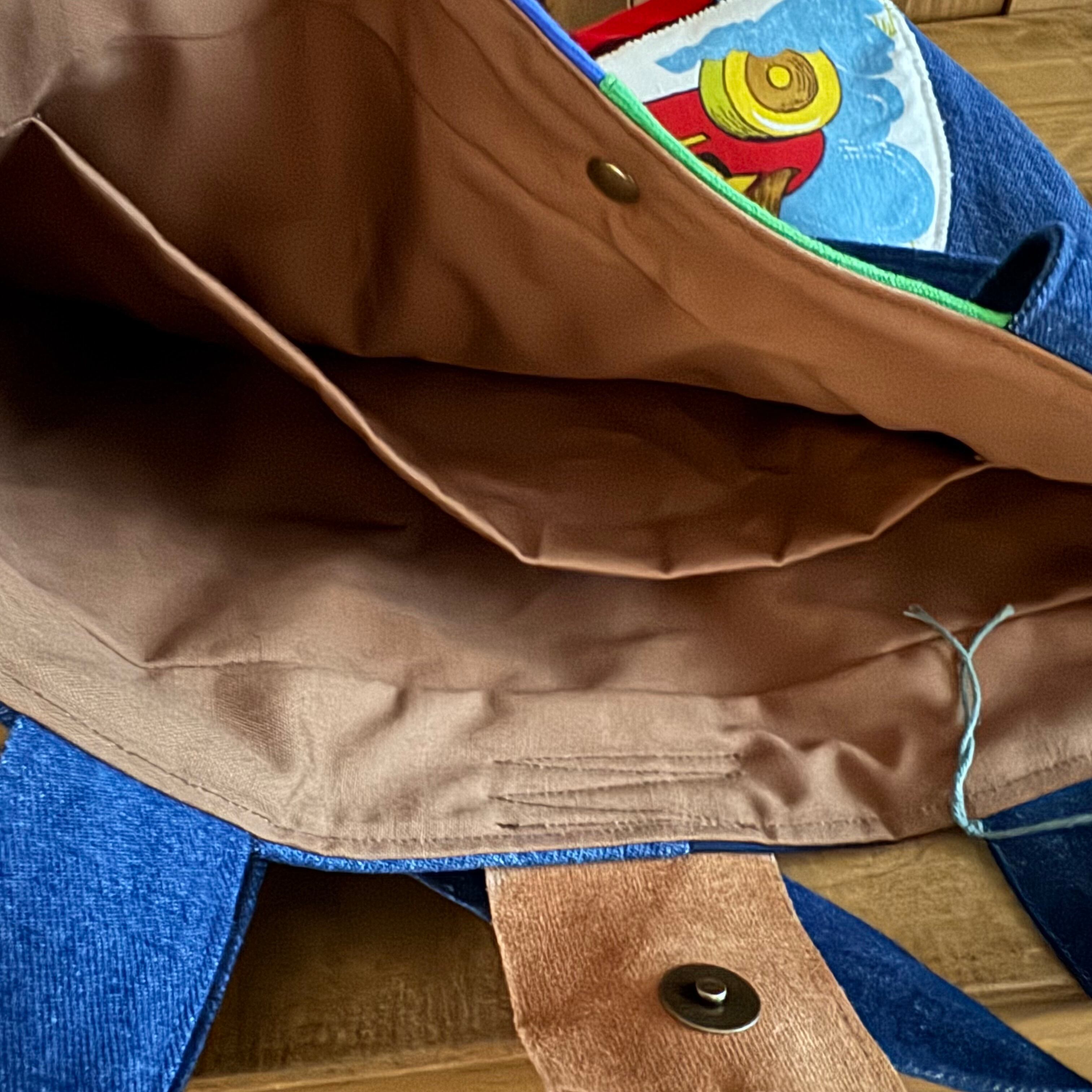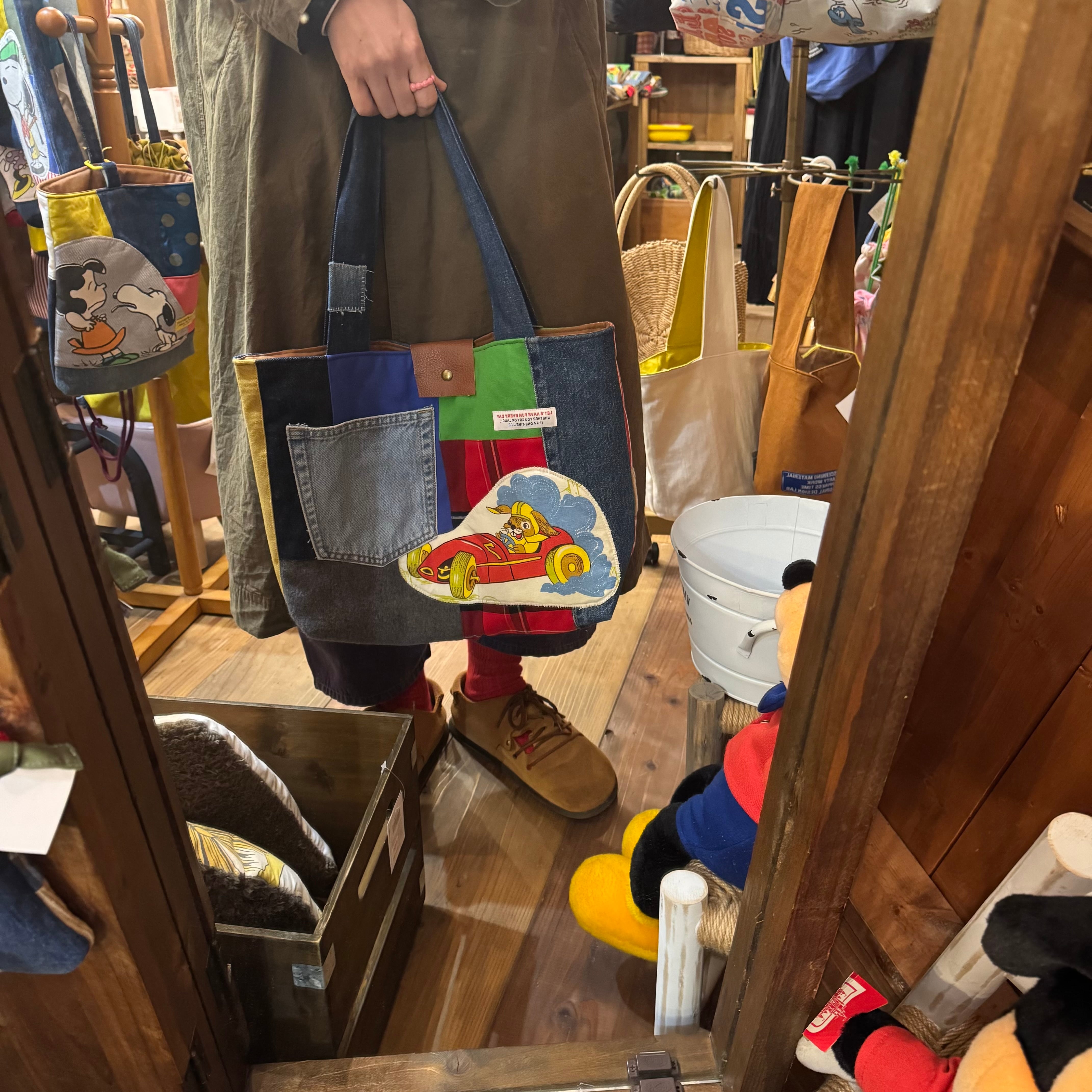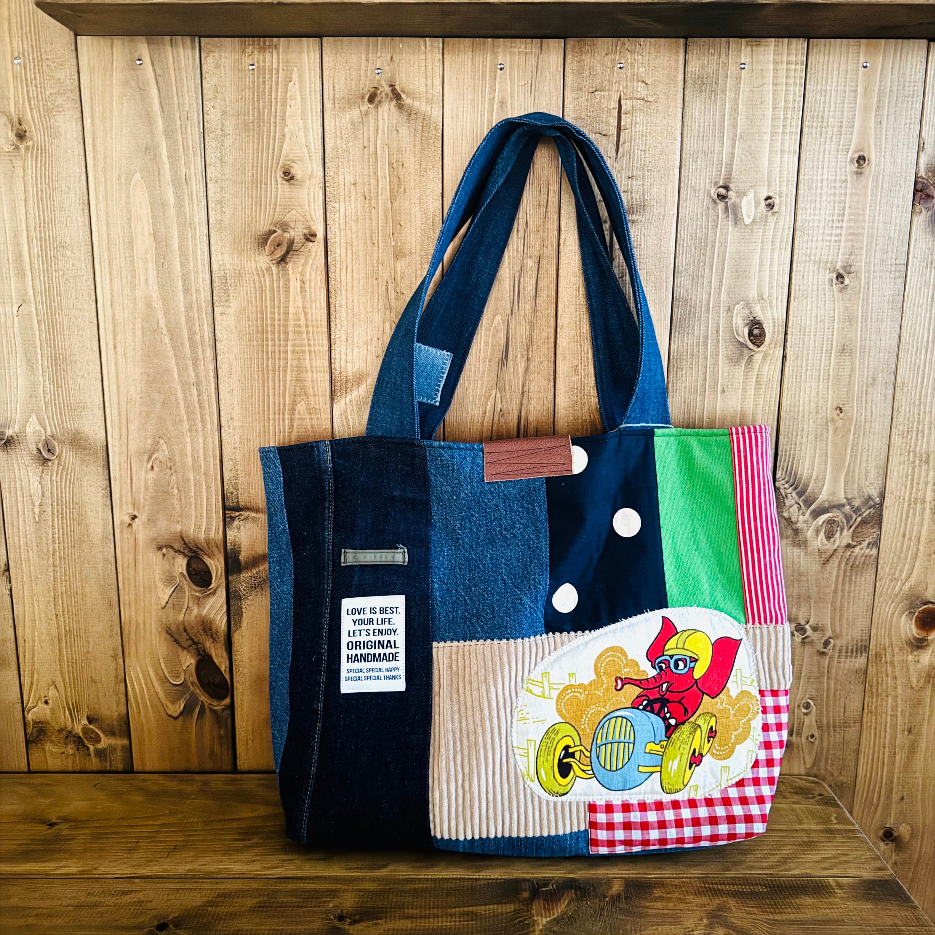 デニム×カラフル布を組み合わせたパッチワークバッグです