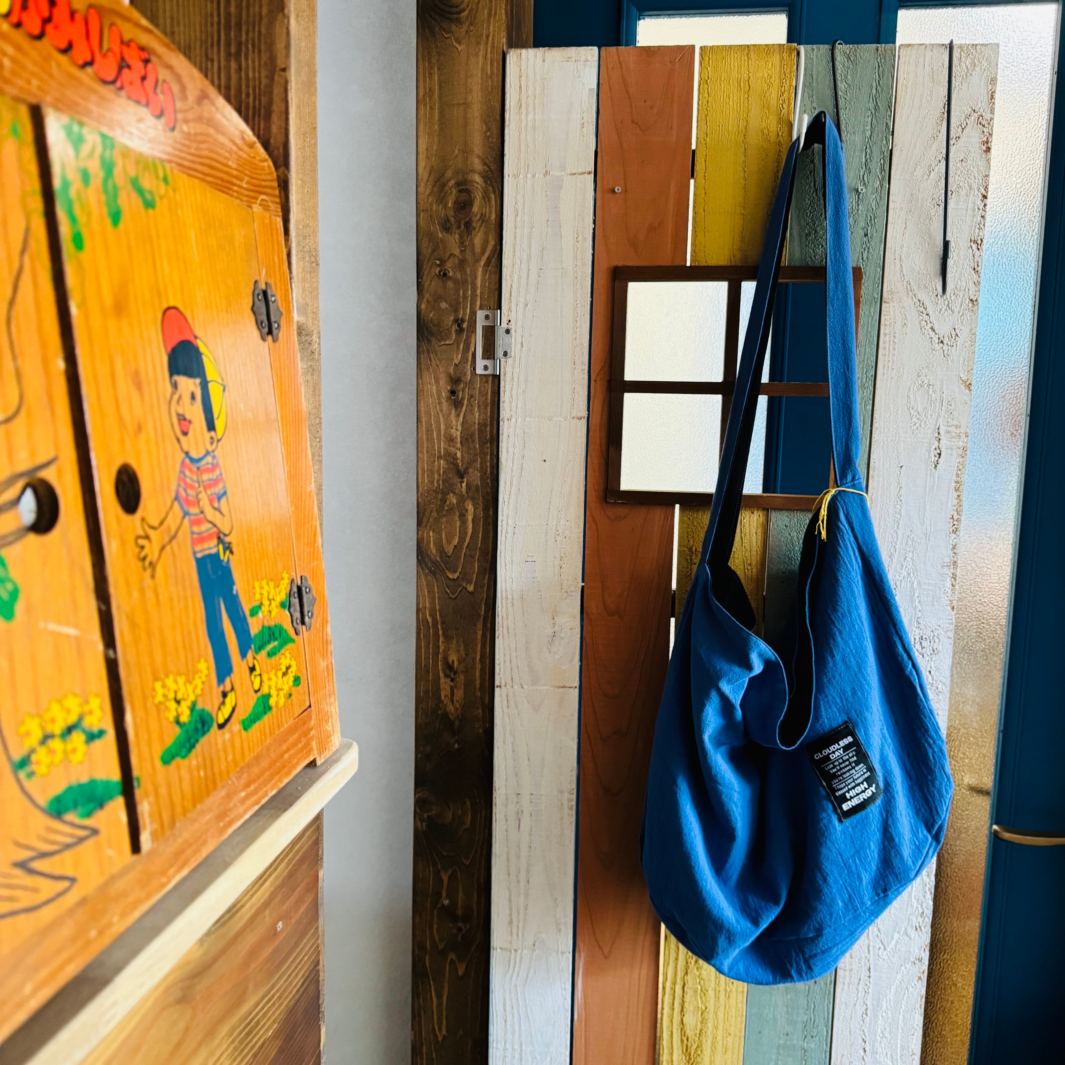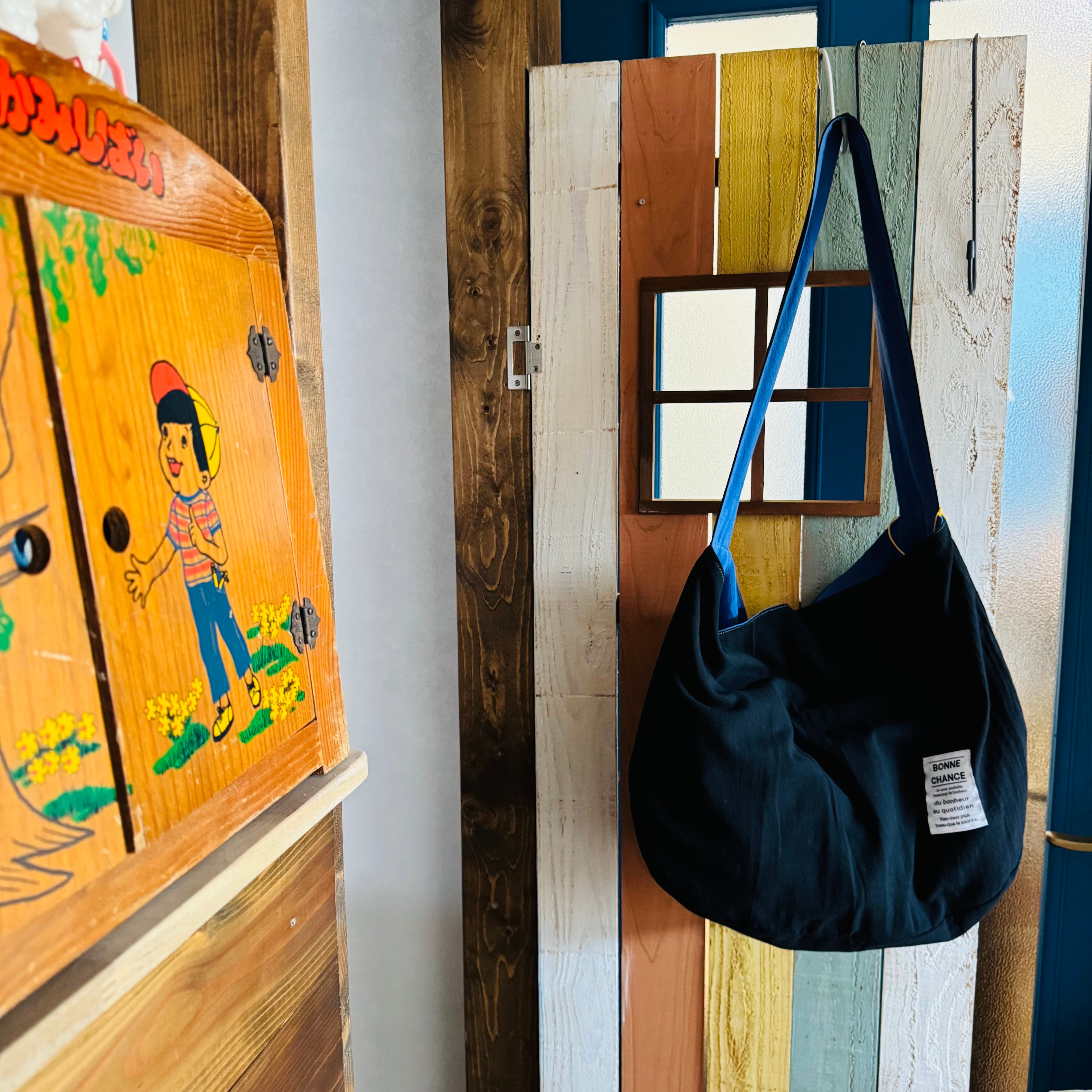 柔らかな黒と青生地でつくった、斜めがけできるショルダーバッグです。