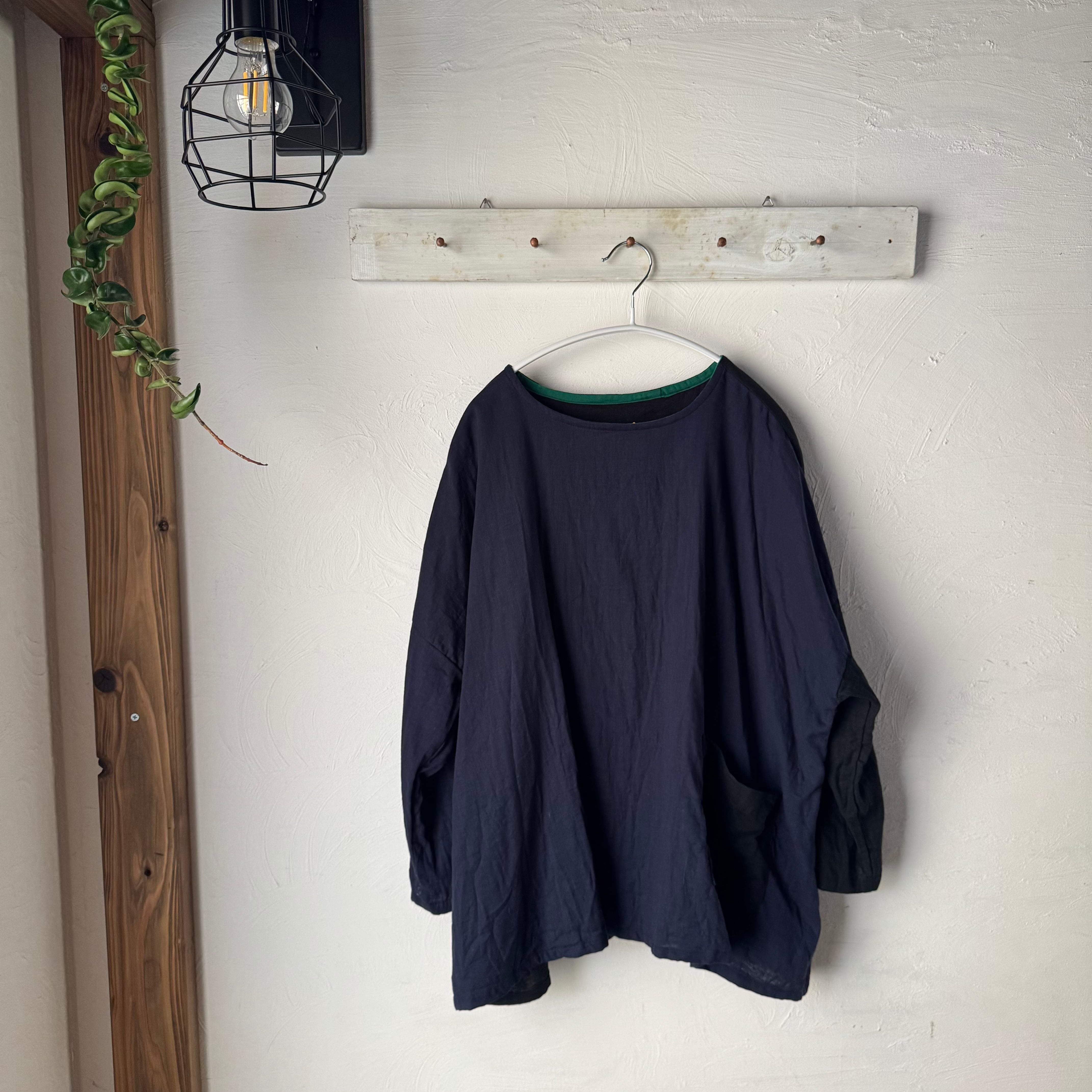 前身頃は落ち着いた紺色、左袖と後ろ身頃とポケットは深みのある黒。
