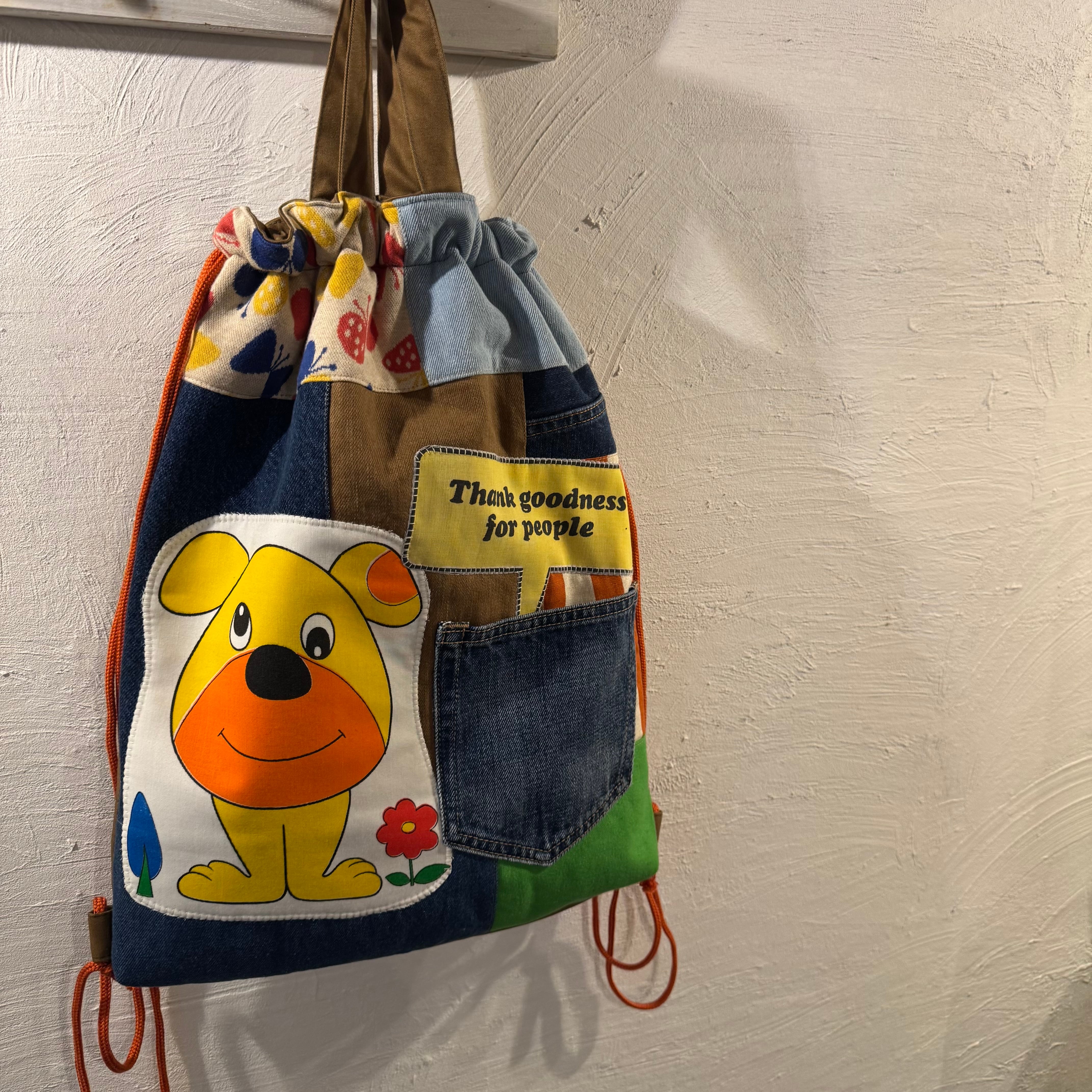 レトロアニマルのビンテージ生地やデニムを組み合わせたナップサックです♪